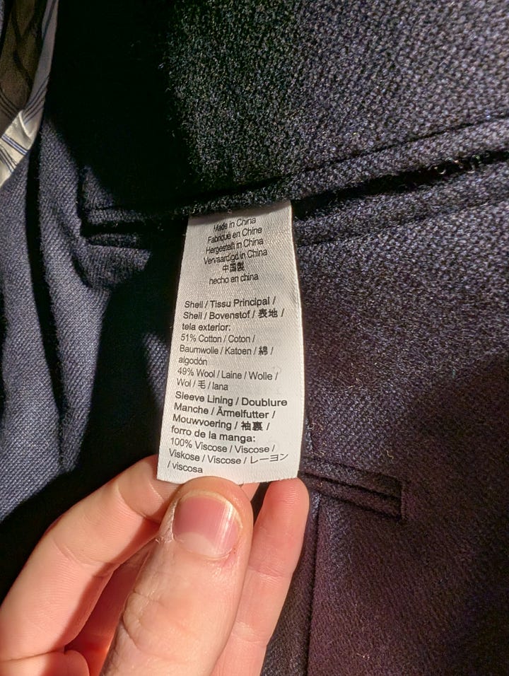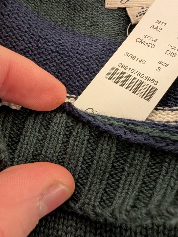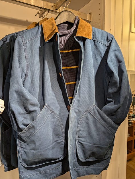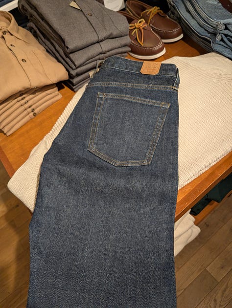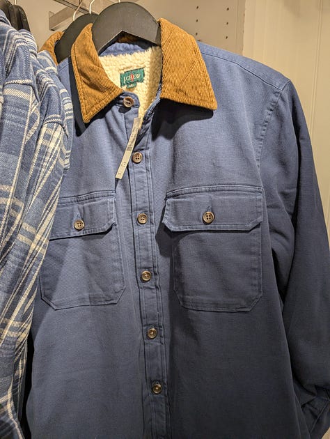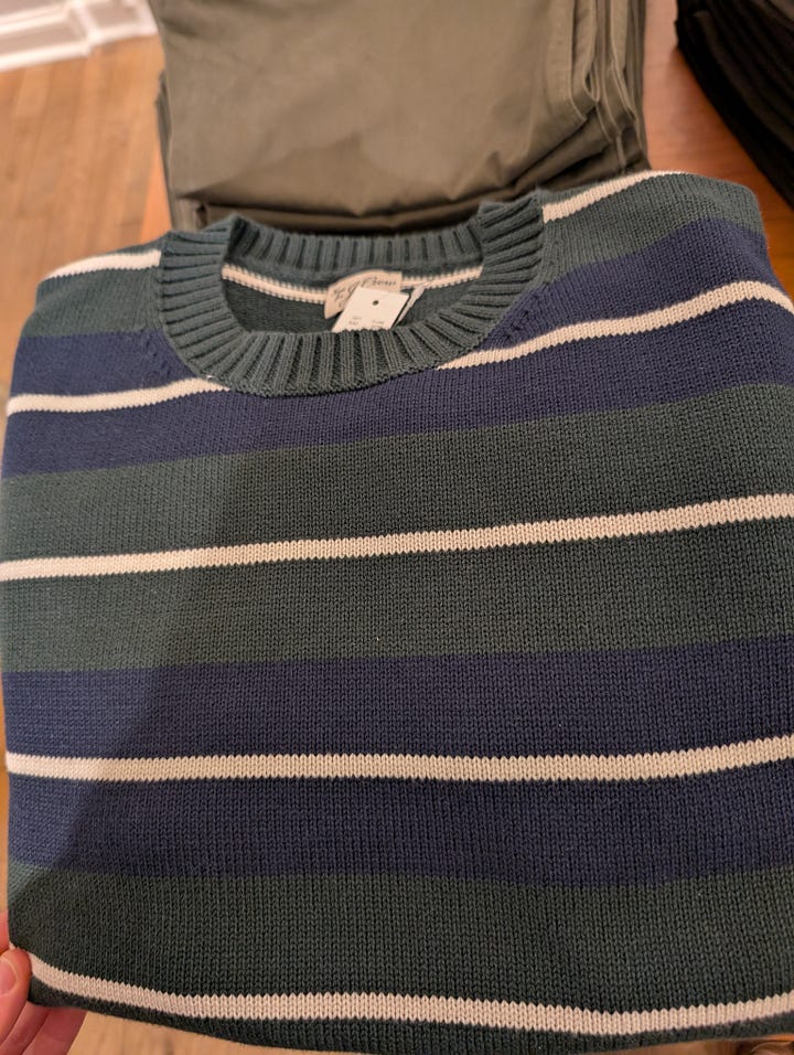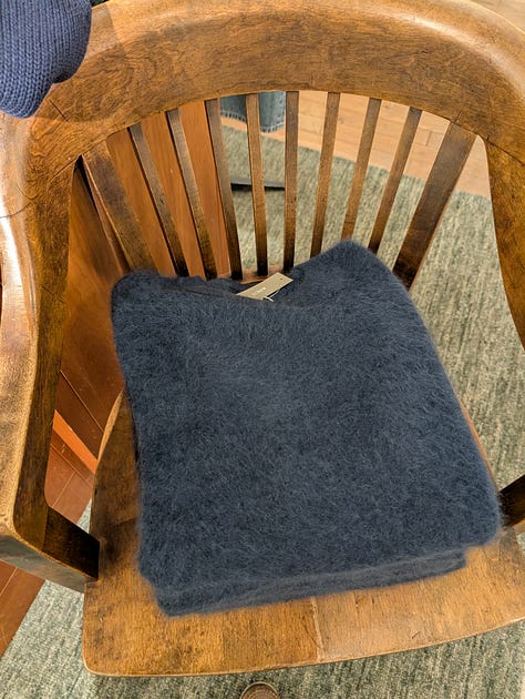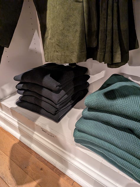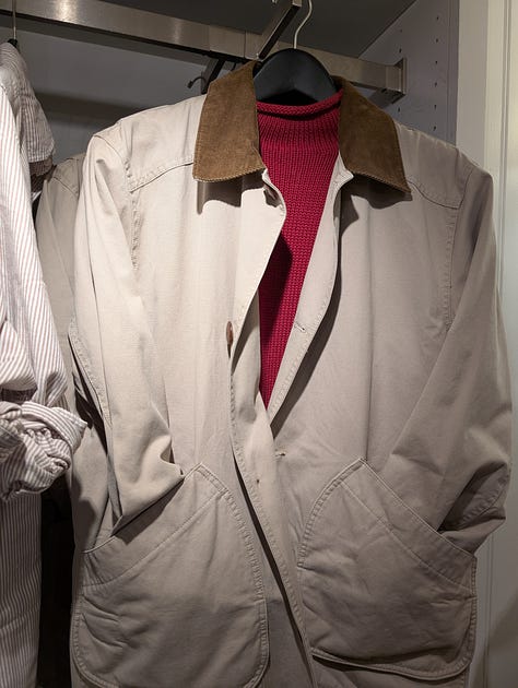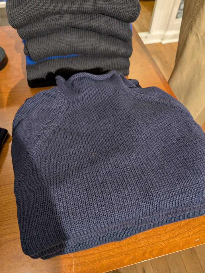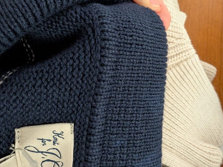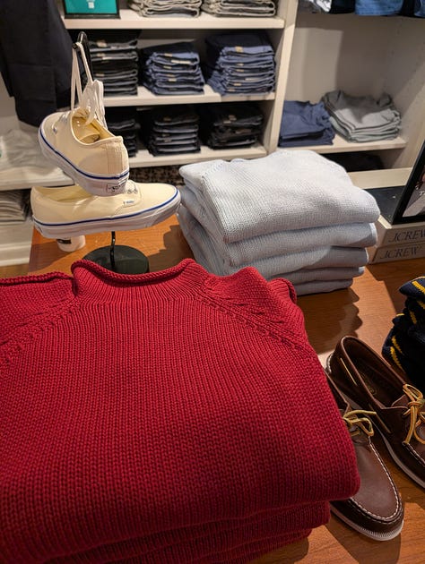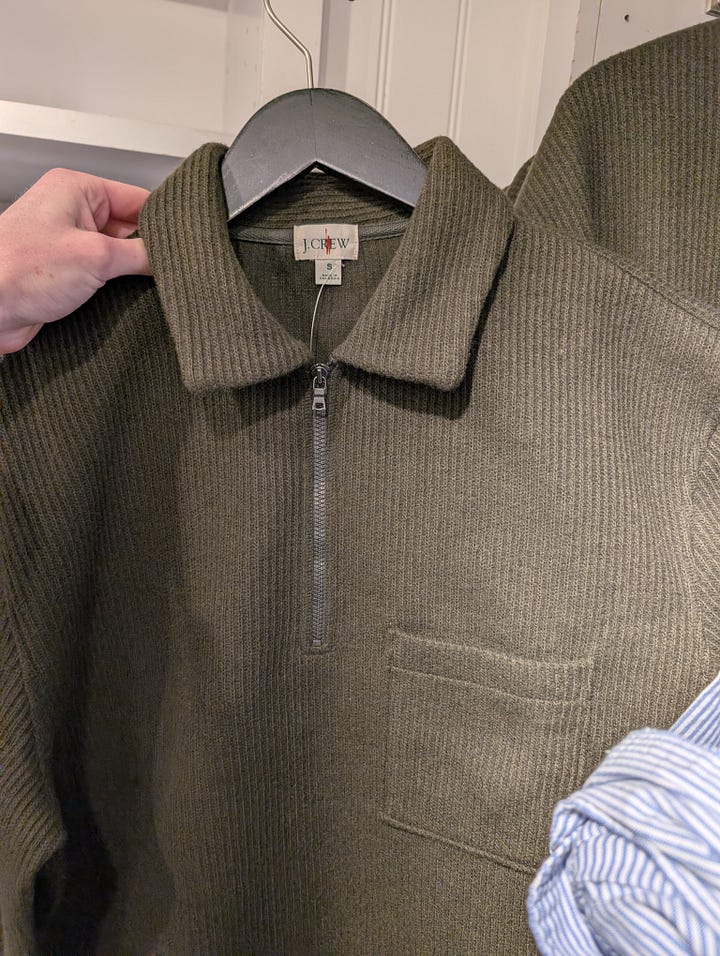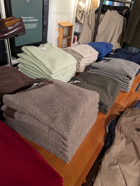 Looking around the rest of the store there were a few curious workwear offerings and odd coats they had on display. The peacoat in the photos was well-made and at a decent price point if you are in the market for one, but I would go try it on yourself in store as peacoats sizing can change drastically from person to person. The car coat they had on offer was nothing special for the price of almost $600 although definitely well-thought-out design wise with a cross neck button collar and well-placed jacket pockets. Other workwear they had on display were barn coats that mimic the classic L.L. Bean designs. If you are in the market for a new barn coat I would recommend buying them from L.L. Bean and not from a copycat design as no one gets it better than the classic. The J. Crew offering is quite nice with the big corduroy collar and well-stitched buttons but for more money I can’t imagine that it is much better if at all than the original. There were also some odd garments that seemed like remnants from the old J. Crew were still on the rack, something worth noting (Photo of a sweater like this shown in the bottom photos with the material label).