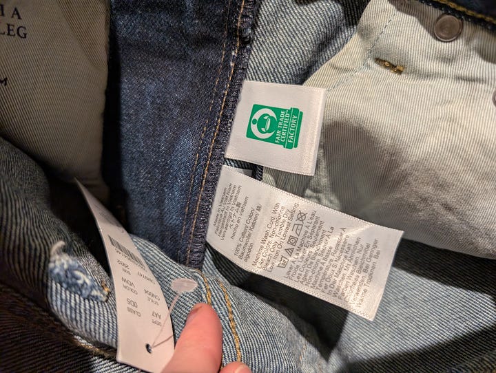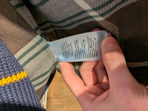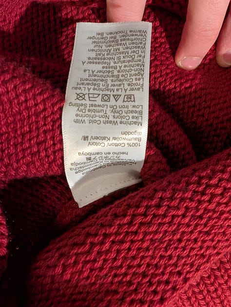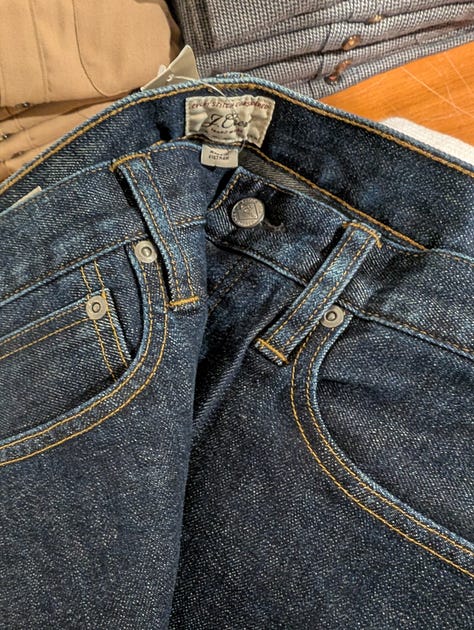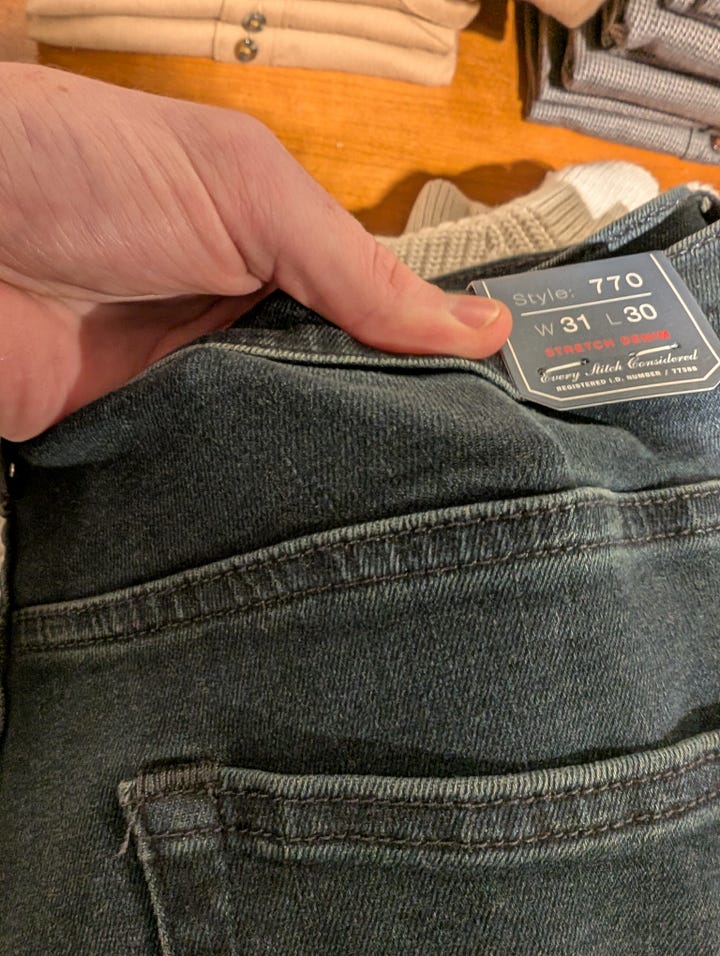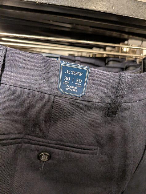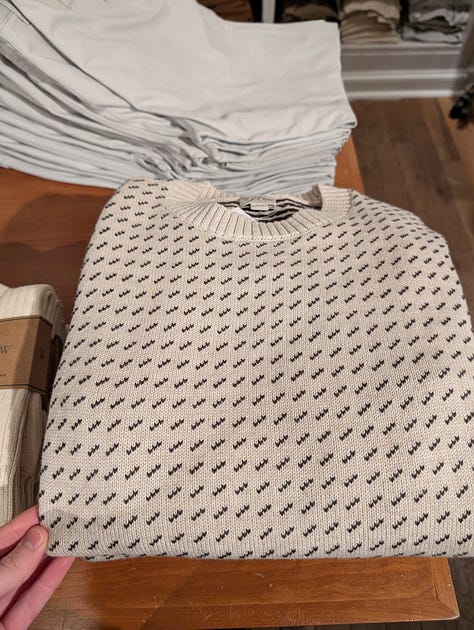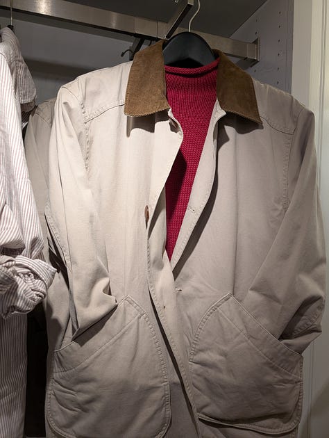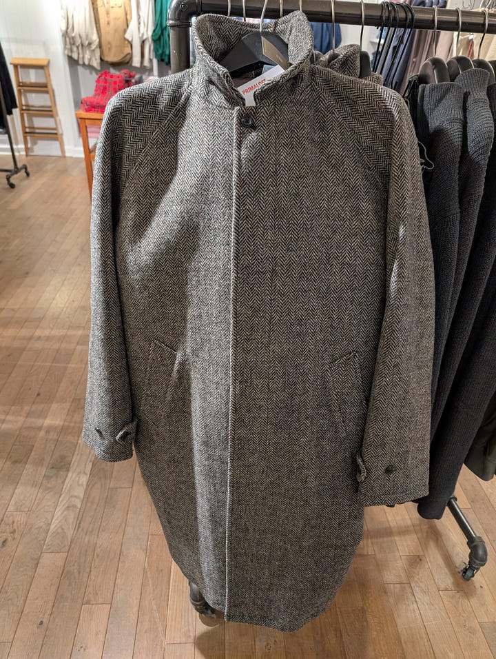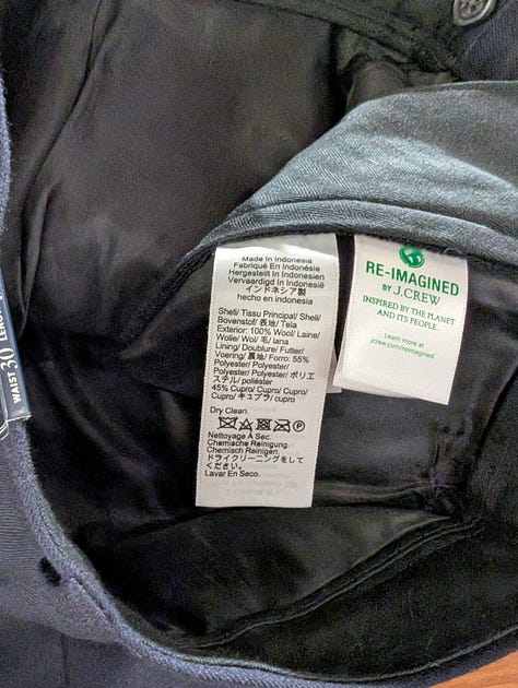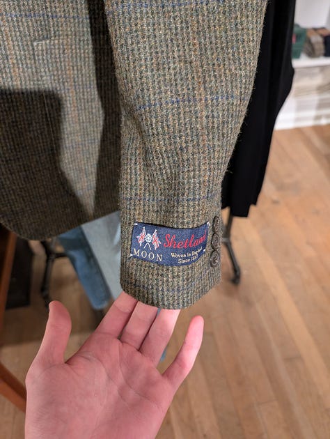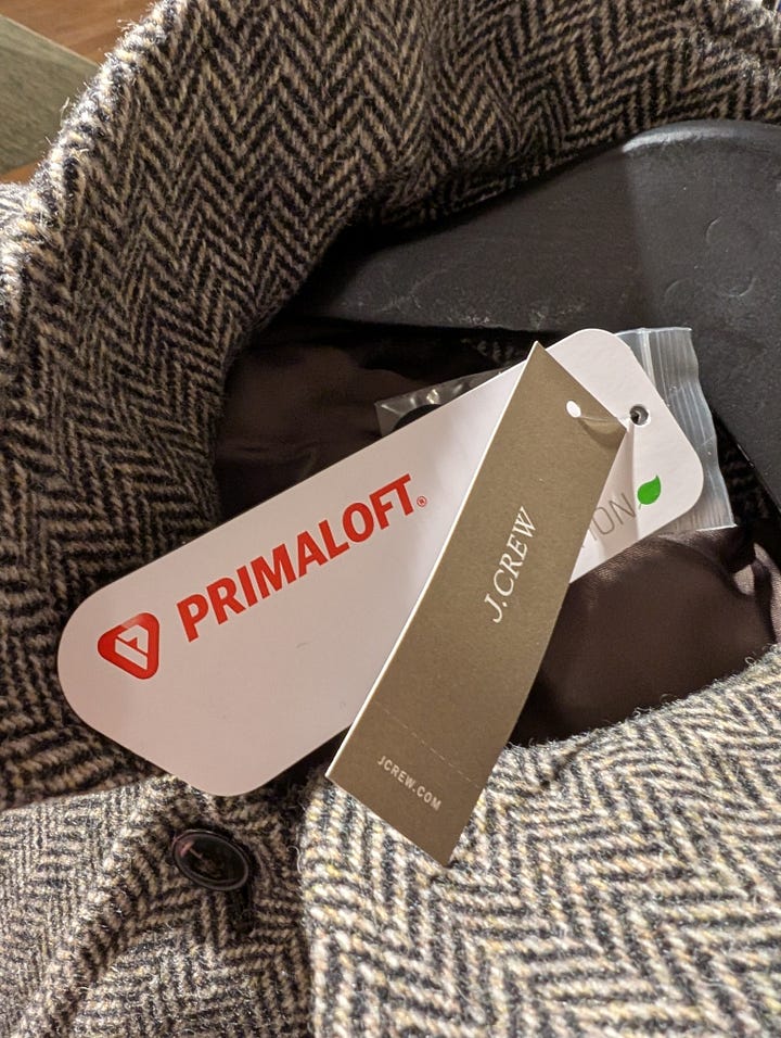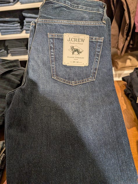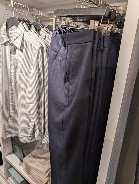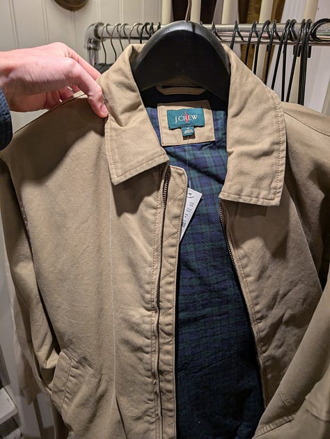 Looking around the rest of the store there were a few curious workwear offerings and odd coats they had on display. The peacoat in the photos was well-made and at a decent price point if you are in the market for one, but I would go try it on yourself in store as peacoats sizing can change drastically from person to person. The car coat they had on offer was nothing special for the price of almost $600 although definitely well-thought-out design wise with a cross neck button collar and well-placed jacket pockets. Other workwear they had on display were barn coats that mimic the classic L.L. Bean designs. If you are in the market for a new barn coat I would recommend buying them from L.L. Bean and not from a copycat design as no one gets it better than the classic. The J. Crew offering is quite nice with the big corduroy collar and well-stitched buttons but for more money I can’t imagine that it is much better if at all than the original. There were also some odd garments that seemed like remnants from the old J. Crew were still on the rack, something worth noting (Photo of a sweater like this shown in the bottom photos with the material label).