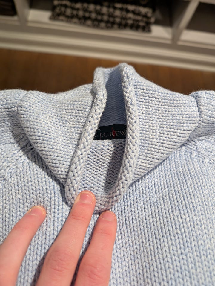 After a disappointing first experience with the J. Crew collection this season I decided to look at some of their most heavily advertised material, the basket stitch sweater. The basket stitch sweater is made of pure cotton and nicely styled like their other offerings. It has a high neckline making wearing a button down underneath sometimes a bit uncomfortable but will cover an undershirt underneath allowing you to wear it as a standalone sweater if you choose. It had heft to the material even being cotton and the weave was well done giving off a good visual texture. The garment is fully fashioned, meaning cut from one piece of fabric with the ends attached by machine link. If you wear a necklace with a pointed edge it could catch and tug at the stitching in the neckline either damaging your jewelry or the garment, just something to be concerned about with this kind of neckline stitching and looser garment weave. Overall the basket stitch sweater seems well built although I would have liked to see some extra consideration taken with the neckline choice.