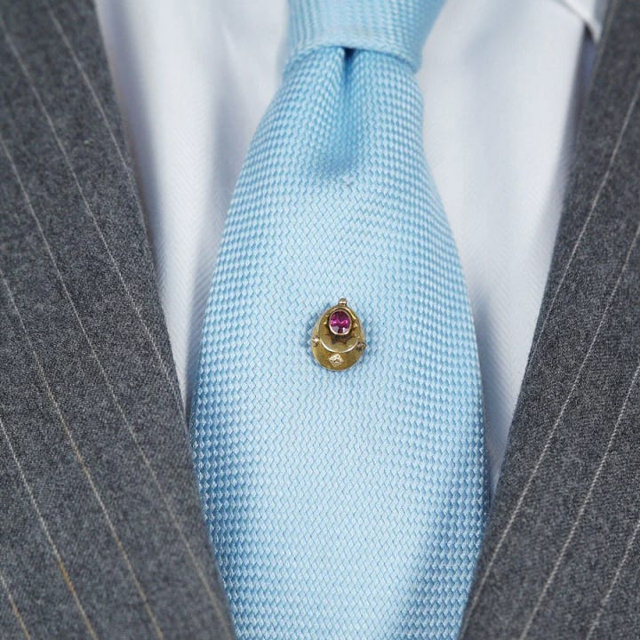 Because these pieces were often sold as sets, it always felt coordinated and harmonious. This coordination is fundamentally missing from what we see today; when men wear these vintage-style items today they are often lacking the harmony they would have been in past times. Cufflinks are always matched, but if a tie bar or pin is added, it is often bought separately and doesn’t match the cufflinks. This is the easiest way to elevate the look of jewelry when worn formally. Due to these pieces being mostly worn with tuxedos, it is imperative that shirt studs should match as well (if worn). For us, a tuxedo is not complete without shirt studs. You can find vintage full sets that include studs, cufflinks, and even a tie bar or stud on secondhand platforms and in vintage stores. We recommend checking vintage or antique stores, as these pieces are often neglected and priced lower as the demand is quite low. Some of us at TNBC have found amazing vintage examples for pennies on the dollar of what they’re worth in weight of metal alone!
