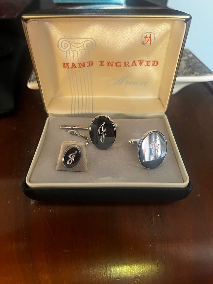 The scene in season 1 of Mad Men when Don Draper goes to Menken’s Department Store to get to know a potential client better, he finds himself and Miss Menken in front of a display case full of cufflinks and tie pins. She selects for him a surprisingly expressive set of medieval knight helmet cufflinks, which haunts him for an episode or two after an awkward encounter on the roof of the store. But what really stuck with me is the selection of cufflinks, tie pins, tie bars, and more was abundant. Even with the social revolutions happening in the 60s, the professional world retained the standards of men’s jewelry from the previous generations. All characters are seen in daily work suits adorned with jeweled tie pins, bars, and cufflinks, things only reserved for formal occasions (or not owned at all) by most today.